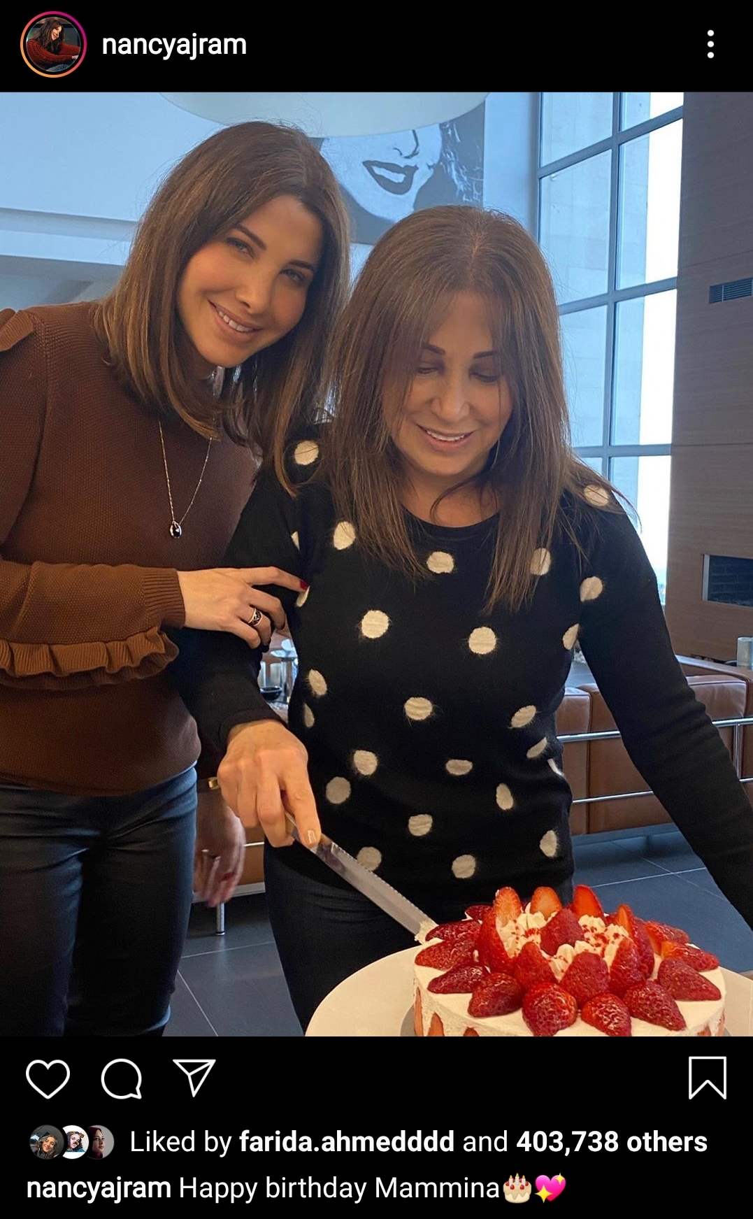 احتفلت الفنانة نانسي عجرم، بعيد ميلاد والدتها، وهنأتها برسالة عبر حسابها الشخصي على “انستغرام”. ونشرت نانسي عجرم، صورة لها مع والدتها، وظهرت فيها وهي تقف إلى جانبها وهما تقطعان قالب الحلوى احتفالاً بيوم ميلاد الأخيرة. وكتبت نانسي في تعليقها: “يوم ميلاد سعيد مامينا”.